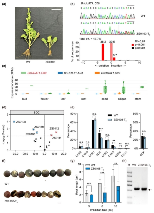对该突变体库田间表型考察发现,T0代群体展现出丰富的表型变异,包括株高、株型、种子含油量及脂肪酸组成等(图2)。如突变体ZS0193-T0表现出了矮化紧凑的株型,经鉴定其BnUUAT1同源拷贝(BnUUAT1.C09)被敲除;该基因为UDP-糖酸转运蛋白,在茎中优势表达,其突变可能影响了细胞壁合成或激素运输。在种子性状方面,突变体ZS0108-T0的含油量较野生型显著降低31.2%,同时伴有种子形态异常和萌发根长变短。基因型鉴定发现其BnER-ANT1.C09基因发生了小片段缺失。该基因编码内质网腺嘌呤核苷酸转运蛋白,在拟南芥中的同源基因已被报道影响种子发育和油分积累。