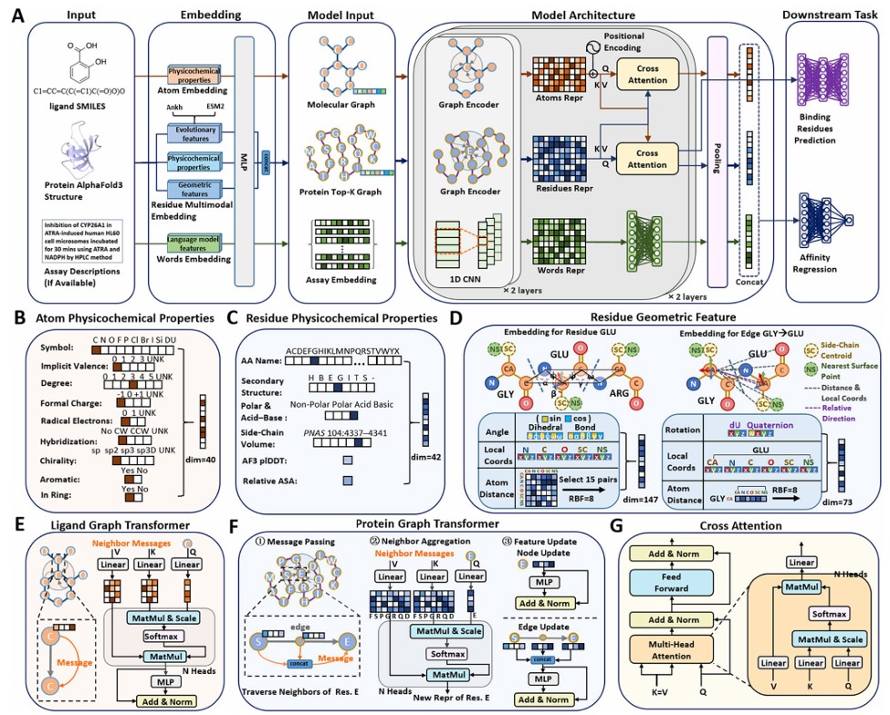 吉林大学生命科学学院分子酶学工程教育部重点实验室韩葳葳教授、韩璐教授研究团队在基于AI的蛋白-配体相互作用研究方面取得重要进展。该研究围绕药物-靶标结合位点和结合亲和力预测的核心难题,构建了多模态蛋白-配体交叉注意力框架,系统整合蛋白序列表示、三维结构特征与配体分子图信息,并引入实验条件信息以提升模型的稳定性与泛化能力。研究进一步实现了结合亲和力预测与蛋白结合口袋识别的统一建模,为虚拟筛选与理性药物设计提供了新的技术路径和理论支撑。研究成果于2026年2月12日在国际学术期刊《Journal of Medicinal Chemistry》上发表。
