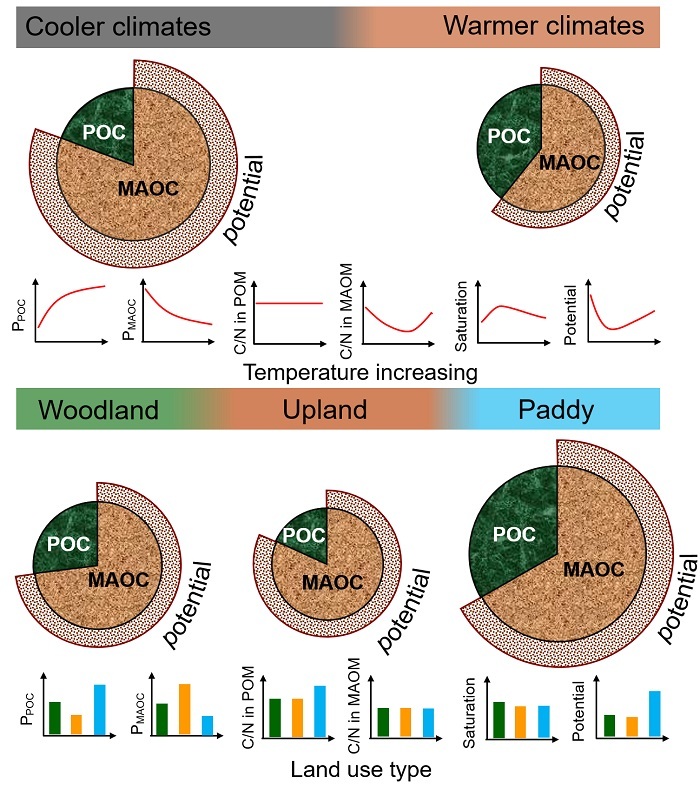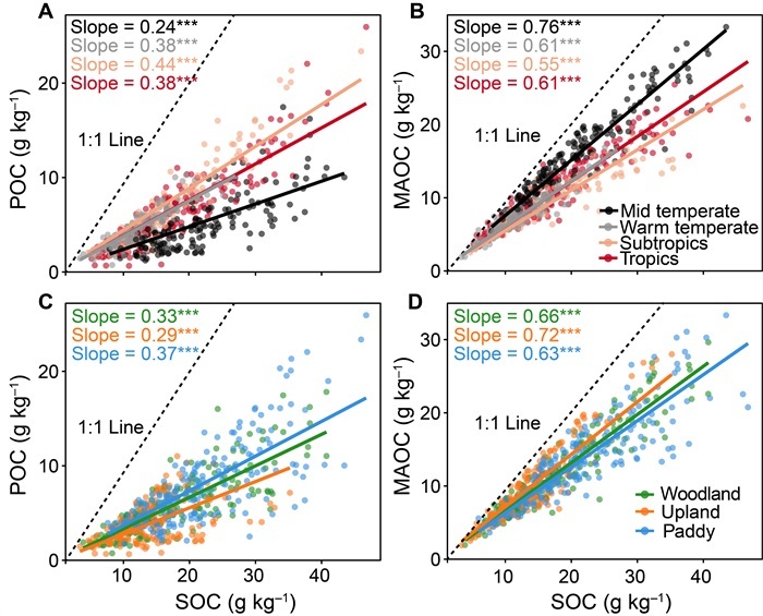 中国科学院亚热带农业生态研究所流域农业环境研究中心陈香碧研究员小组从我国东部四个气候带(中温带-黑土、暖温带-潮土、亚热带-红壤和热带-砖红壤)采集240组邻近林地、旱地和水田土壤样品,采用粒径分级技术,量化了颗粒态有机碳(POC)和矿物结合态碳(MAOC)对土壤总碳的贡献,进一步采用边界线法估算了MAOC饱和水平及固持潜力。结果发现:土壤总有机碳含量以南方(亚热带和热带)低于北方(中温带和暖温带),且每个气候带总体表现为稻田>林地>旱地。所有土壤有机碳库组成均以MAOC(60%~77%)为主,但南方土壤MAOC对总有机碳的贡献(58%)低于北方(69%)。农业土地利用重塑了土壤有机碳库组成及其稳定性:与自然林地相比,水田土壤POC和MAOC含量均更高,但其碳库稳定性低(低MAOC/POC比值);旱地土壤POC和MAOC含量均更低,但碳库稳定性强(高MAOC/POC比值)。基于土壤现时MAOC含量与黏粉粒含量的95th分位数回归结果发现,四个气候带农田土壤MAOC积累均尚未达到饱和,主要归因于农田土壤有机碳输入量不足,而非矿物活性位点限制。当前,土壤MAOC平均饱和水平约60%,但不同样本间土壤MAOC饱和水平变异较大,说明我国农田土壤固碳潜力大、提升空间可观。本研究强调,提升土壤有机碳库的管理策略必须因地制宜,充分考虑当地土地利用方式、气候条件、土壤碳库组成及其饱和水平。
