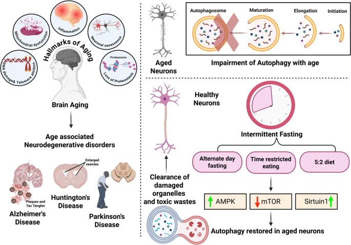 衰老通过自噬功能下降影响神经退行性疾病发展,间歇性禁食可能通过激活AMPK/Sirtuin 1通路增强自噬,但存在个体差异和潜在代谢风险。