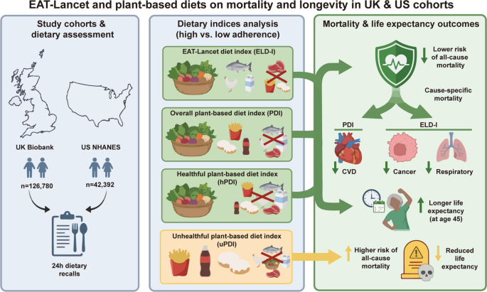 本研究评估了EAT-Lancet饮食和植物基饮食模式与死亡率和预期寿命的关系。通过对英国生物银行和美国国家健康与营养调查(2003-2018)数据分析发现,高遵循EAT-Lancet饮食(ELD-I)和整体植物基饮食(PDI)分别使全因死亡率降低13%-29%,预期寿命增加1.33-4.31年。ELD-I与癌症和呼吸系统疾病死亡率降低相关,而PDI显著降低心血管疾病死亡率。研究证实遵循环保饮食模式可显著延长寿命并降低多种疾病死亡率。