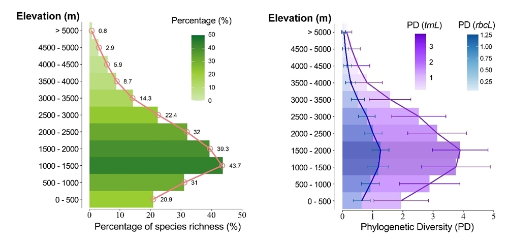中国科学院西双版纳热带植物园(以下简称“版纳植物园”)森林生态系统结构、功能与动态研究组尹相博副研究员联合国内外学者,通过整合全球苔藓植物分布数据、海拔梯度研究资料、IUCN红色名录评估信息、GBIF数据库、文献meta分析等,系统评估了全球苔藓植物多样性格局、灭绝风险以及保护缺口。研究发现:1)全球共有37个国家或地区拥有超过1000种苔藓植物,中国和印度的丰富度最高;2)在全球尺度上,苔藓植物的物种多样性和谱系多样性沿海拔呈明显的单峰型分布(在1000–2000米达到最高值);3)目前仅约1.5%的苔藓物种被纳入IUCN红色名录评估,远低于鸟类、哺乳动物等类群的评估比例;4)由于研究资源和经费的分配不均导致目前苔藓保护工作的关注地区(如欧洲)与苔藓多样性分布的热点地区(如热带山地)存在严重的分歧;5)Meta分析表明,农业活动和森林砍伐是苔藓多样性下降的显著因素,但同时不同地区威胁类型存在明显差异。例如,非洲和南美洲的苔藓多样性主要受到森林砍伐影响,而欧洲则面临气候变化和外来入侵物种带来的压力。