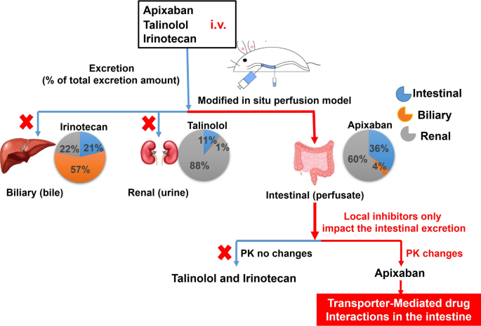 使用改良的大鼠原位肠道灌注模型,评估药物与转运蛋白抑制剂之间的相互作用及其对静脉给药药物药代动力学的影响的工作流程。%总药物排泄量 = (胆汁排泄量/肾脏排泄量/肠道排泄量)÷(胆汁排泄量+肾脏排泄量+肠道排泄量)× 100。