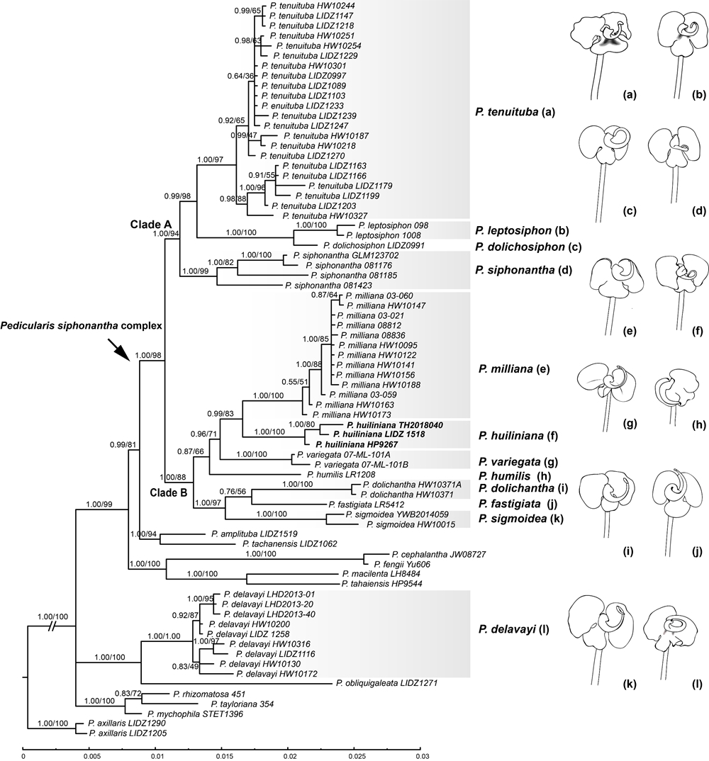 相关成果以“ Phylogenetic analyses and morphological comparisons of the Pedicularis siphonantha complex (Orobanchaceae) reveal a new cryptic species P. huiliniana from north-central Yunnan, China ”为题发表在 Willdenowia 上