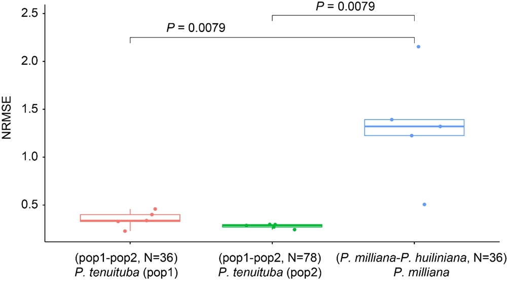 图3.种群内和种群间地理—遗传距离归一化均方根误差(NRMSE)结果比较。以狭管马先蒿南北两个种群独立构建距离遗传模型,随后以种群间距离-遗传数据拟合种内模型相互检验获取零模型分布。对于候选物种对滇西北马先蒿和轿子山马先蒿,在滇西北群体内构建种内遗传与距离模型,随后以滇西北-轿子山马先蒿地理距离以及遗传数据拟合模型获取候选物种NRMSE分布。