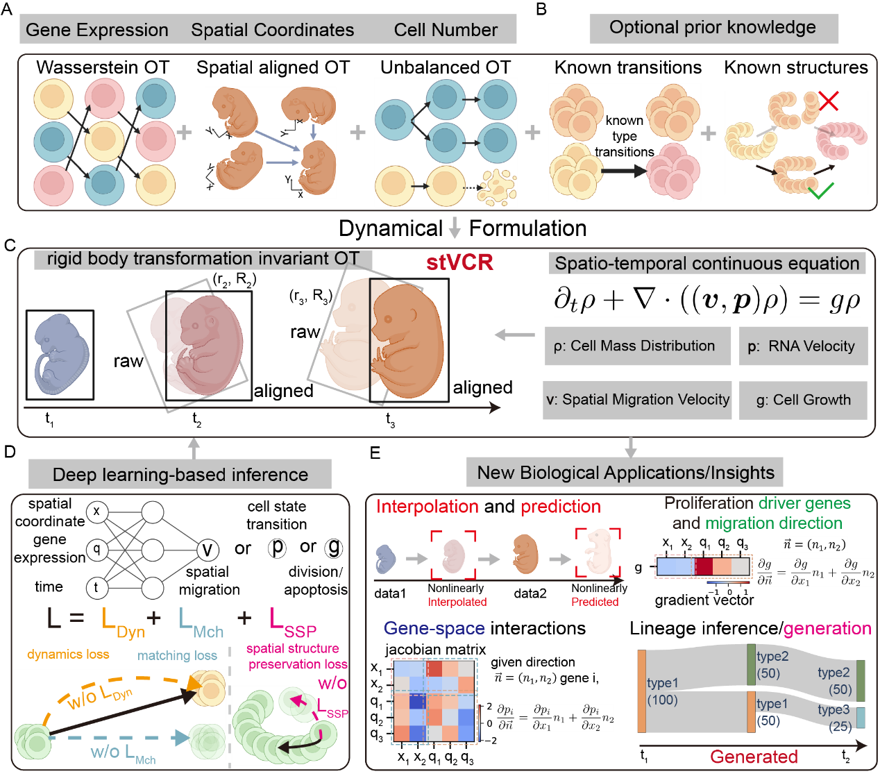 在模型构建阶段,研究团队针对时空转录组数据的特性设计了3个核心模块:首先,针对基因表达数据,利用Wasserstein最优传输模拟分布的时间耦合;其次,针对细胞在物理空间中的位置变化,考虑到不同时间点样本可能存在的旋转和位移,采用了刚体变换不变的最优传输进行空间对齐;最后,针对发育过程中细胞分裂和凋亡导致的细胞数量变化,引入了不平衡最优传输来模拟种群动态。此外,stVCR还允许整合已知的生物学先验知识(如细胞类型转换关系)和空间结构保持先验,以生成更具生物学意义的结果(图1)。