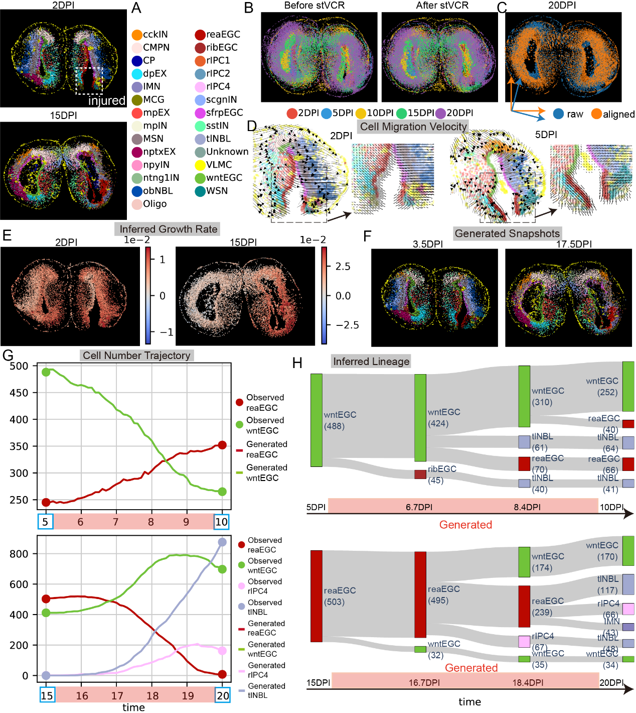 此外,stVCR还揭示了伤口处附近细胞的定向迁移、显著升高的细胞增殖速率,以及构建了EGC类型细胞的连续发育谱系(图2)。
