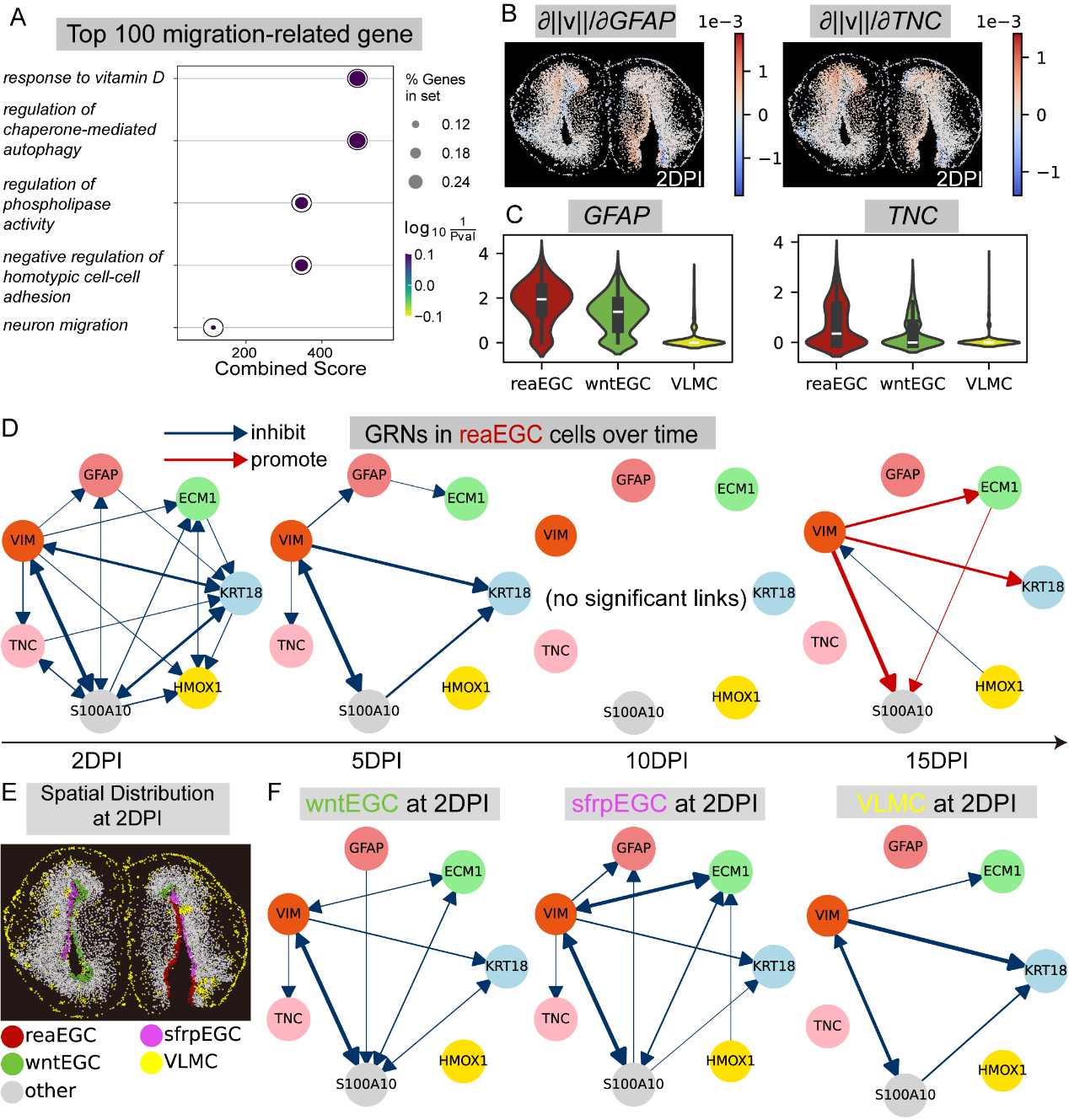 除了重构表型轨迹,stVCR还能深入解析潜在的分子机制。通过计算物理迁移速度和生长率对基因表达的偏导数,研究团队识别出了“迁移驱动基因”和“生长驱动基因”。GO富集分析表明这些基因与神经元迁移、细胞粘附调节及核糖体生物合成密切相关。此外,stVCR推断的动态基因调控网络显示,关键基因之间的调控关系随时间发生动态变化,且受到细胞空间位置的显著影响,展示了其在解析复杂时空基因表达模式方面的解释能力(图3)。