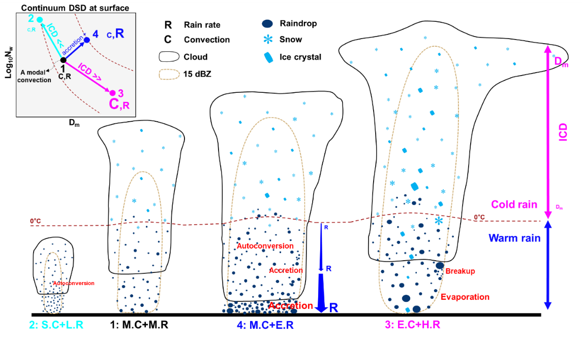 图1:左图为强降水雨滴谱连续体分布。横轴为质量加权平均粒径(Dm,表征雨滴大小),纵轴为归一化截距参数(log10Nw,表征雨滴数浓度)。填色为Dm-log10Nw的概率分布,紫色圆点为站点气候平均值,黑线为紫色圆点的线性拟合。两个灰色方框对应传统的海洋性和大陆性对流类型区。右图基于星载雷达观测的降水微物理过程。黑色轮廓为Dm-log10Nw的相对频率,白色轮廓为冰云厚度(ICD,表征对流深度),填色为降水的暖雨贡献比,虚线表示降水率。1指向不同的数字表示了强降水的不同发展路径
