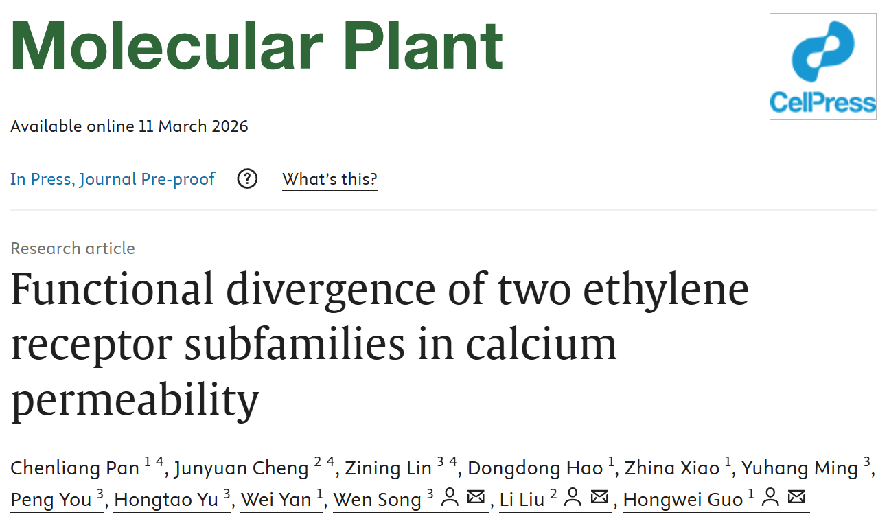 2026 年3月11日,北京师范大学刘莉教授团队联合南方科技大学郭红卫教授团队和中国农业大学宋文教授团队在Molecular Plant上在线发表题为Functional divergence of two ethylene receptor subfamilies in calcium permeability的研究论文