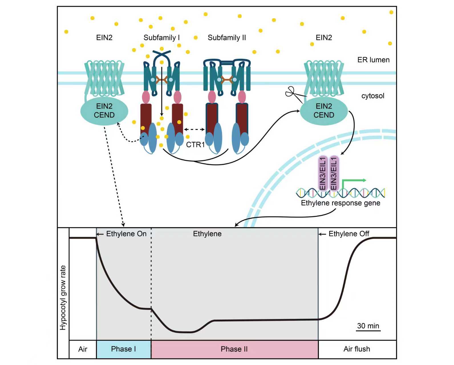 乙烯作为最早被发现、也是最重要的植物激素之一,广泛调控植物的生长发育和环境胁迫的响应。尽管乙烯受体ETR1是首个通过遗传学鉴定的植物激素受体,但受体感知乙烯后如何启动下游信号转导,近四十年来一直是领域内尚未解决的核心问题。