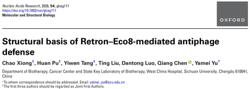 近日,我院生物治疗全国重点实验室余雅梅研究员团队在生物化学与分子生物学领域国际知名期刊Nucleic Acids Research (IF: 13.1)在线发表了题为“Structural basis of Retron–Eco8-mediated antiphage defense”的论文。该研究详细阐述了Retron-Eco8系统通过形成超分子复合物降解核酸来抵御噬菌体侵染的分子机制。这一研究为理解原核生物逆转录依赖的免疫机制提供了全新视角,同时为基于Retron系统的基因编辑技术开发提供结构与机制基础。