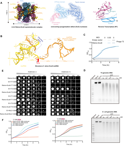 随后,研究团队利用冷冻电镜解析了Retron-Eco8单独和结合ATP-Mg2+的高分辨率结构,发现msDNA、RT以及核酸酶可以形成稳定的超分子复合物,该复合物各组分以4:4:4的化学计量比组装。研究团队通过对Retron-Eco8系统敏感的噬菌体基因组序列分析,发现这些噬菌体都编码单链DNA结合蛋白(SSB)。在大肠杆菌中同时表达 Retron-Eco8 与 SSB 蛋白会明显抑制细菌生长。提示SSB激活了Retron-Eco8系统抗噬菌体防御活性,通过流产感染策略促使感染了噬菌体的细胞死亡,从而阻断噬菌体复制,保护周围未被感染的细菌。