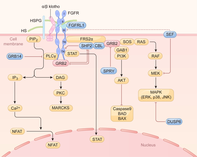 FGF信号受到精密的多层次调控。一系列负反馈机制确保信号的精确性和瞬时性,包括:1)Sprouty(SPRY)蛋白通过干扰GRB2或RAF抑制RAS/MAPK通路;2)SEF蛋白通过结合MEK-ERK复合物阻止ERK入核;3)双特异性磷酸酶6(DUSP6/MKP3)直接去磷酸化ERK使其失活;4)E3泛素连接酶CBL介导FGFR和FRS2α的泛素化降解,从而终止信号。