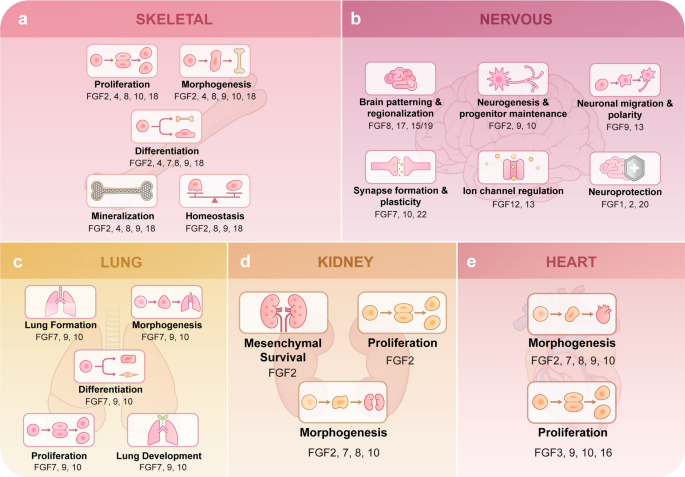 FGF信号在多种器官的发育和成年期组织稳态维持中扮演着“指挥官”的角色。在骨骼系统中,FGF2、FGF4、FGF8、FGF9、FGF10、FGF18等成员协同调控骨骼细胞的增殖、分化和矿化,对肢体形态发生和骨骼生长至关重要。在大脑中,FGF8、FGF17和FGF15/19参与脑部图式形成和区域化,而FGF2、FGF9、FGF10等则维持神经发生和突触可塑性。在肺部,FGF7、FGF9和FGF10是肺发育的主调控因子,共同协调肺组织的形态发生、上皮分支和细胞分化。在心脏,多个FGF成员调节心脏形态发生和心肌细胞增殖。在肾脏,FGF2、FGF7、FGF8、FGF10等介导肾脏的形态发生。