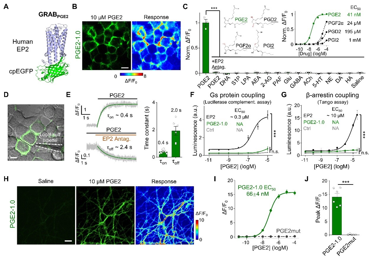 在这一工作中,李毓龙实验室运用GRAB探针策略(GPCR-Activation Based Sensor),以人类PGE2受体(EP2)为骨架,将循环重排的绿色荧光蛋白(cpEGFP)插入其第三胞内环(ICL3)。经过对插入位点的系统筛选、连接肽段的系统性优化,最终得到了表现最优的荧光探针GRABPGE2-1.0(简称PGE2-1.0)。在HEK293T细胞和原代神经元中,PGE2-1.0都表现出了良好的膜定位。神经细胞中表达的PGE2-1.0探针对外源加入的PGE2表现出约1300%的荧光信号响应(ΔF/F0: ~1300%)和约66 nM的亲和力(EC50:~66 nM)。同时,该探针具备极高的分子特异性,对结构相似的其他前列腺素类物质(如前列腺素PGD2、PGF2α、前列环素PGI2)以及经典的神经递质和神经调质都几乎不响应。此外,PGE2-1.0能够在秒级时间尺度上快速响应PGE2的浓度变化,且不激活GPCR下游的信号通路,从而保证探针表达时不会干扰正常的生理活动(图1)。