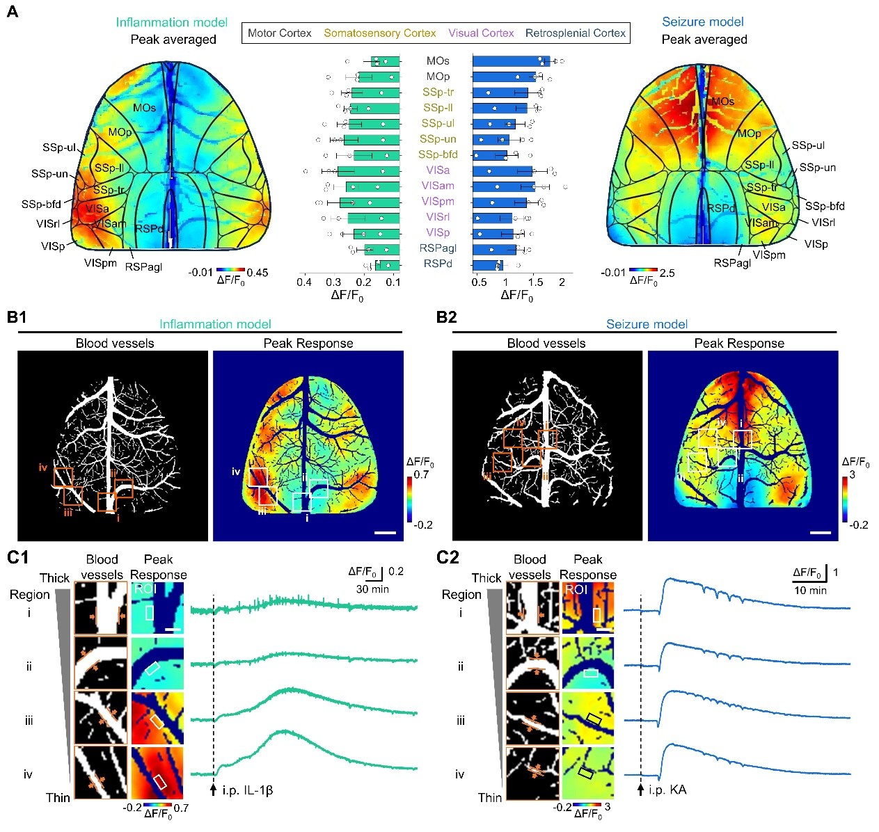 进一步深入分析发现,PGE2的释放在这两种病理模型中还存在显著的空间差异。癫痫模型中PGE2反应最强烈的区域主要集中在皮层前部;而在炎症模型中,PGE2的强烈释放则高度集中在血管末端或分叉处附近,并且与临近血管的直径大小呈现出明显的负相关性。这一直观的成像结果为长期以来“血管内皮细胞可能是炎症期间脑内PGE2主要来源”的假说提供了有力的可视化支持(图4)。