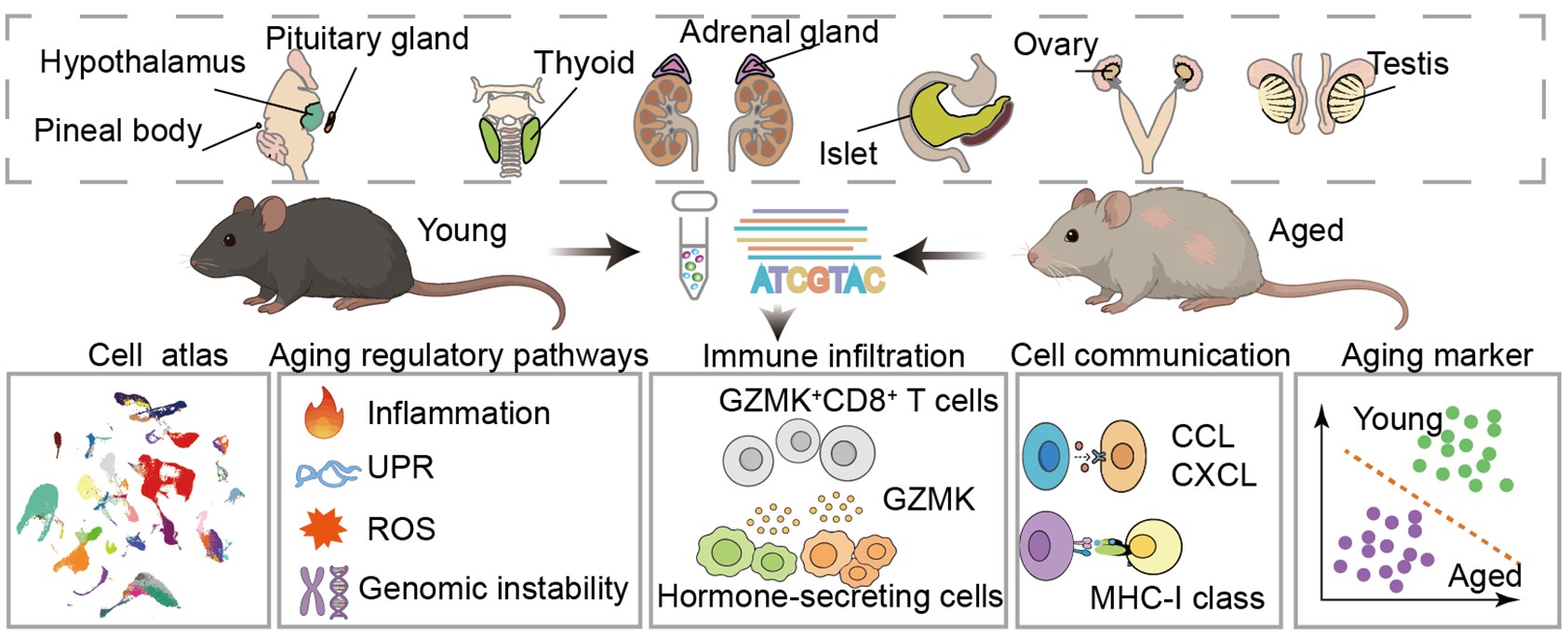 在发表于Protein&Cell的研究中,研究团队利用单细胞RNA测序(single-cell RNA sequencing)技术系统描绘了小鼠内分泌系统衰老的细胞与分子图谱。内分泌系统是维持机体稳态的重要调控网络,由下丘脑、垂体、甲状腺、肾上腺、松果体、胰岛以及性腺等多个器官共同组成。随着年龄增长,这些器官的激素分泌模式和调控反馈逐渐发生改变。