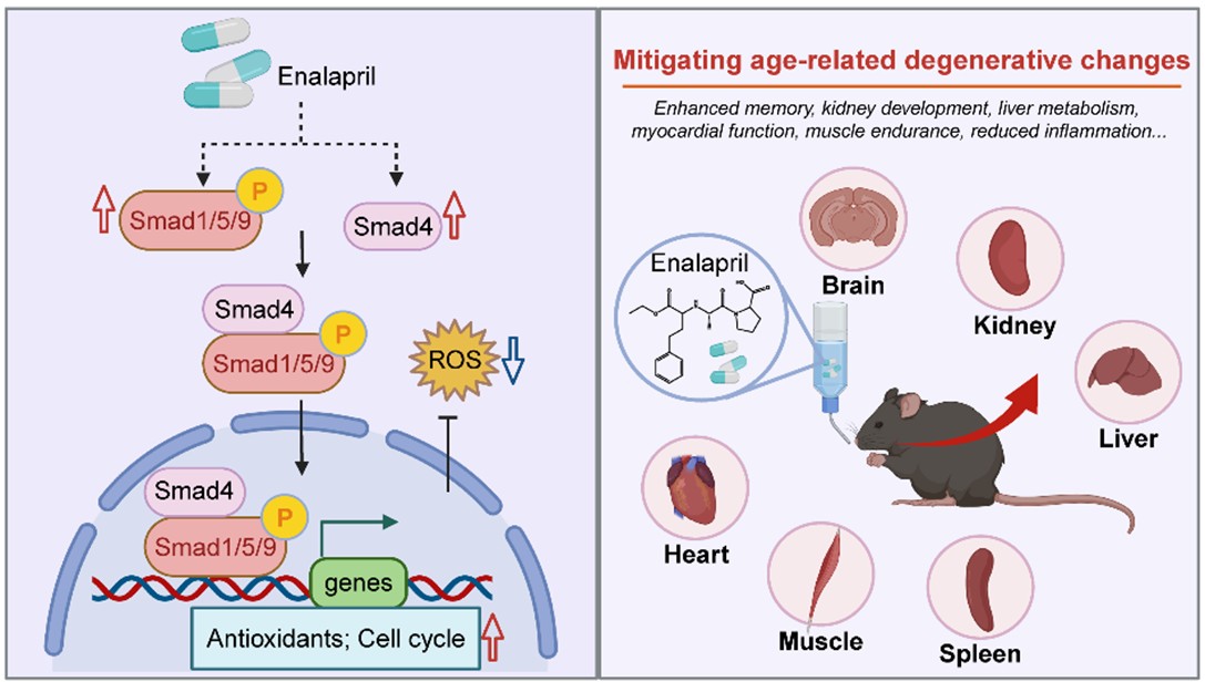 图4 依那普利延缓衰老的作用机制示意图。依那普利通过激活pSmad1/5/9信号通路发挥抗衰老作用,在细胞水平促进细胞增殖并降低活性氧(ROS)水平,在动物水平改善多器官功能。具体而言,依那普利可提高pSmad1/5/9和Smad4的表达水平,促进下游抗氧化基因及细胞周期相关基因的表达,从而增强细胞增殖能力并减轻氧化应激。此外,在小鼠模型中,依那普利能够缓解多种年龄相关退行性变化,包括改善记忆功能、提升肾脏功能、增强肝脏代谢能力以及整体器官功能
