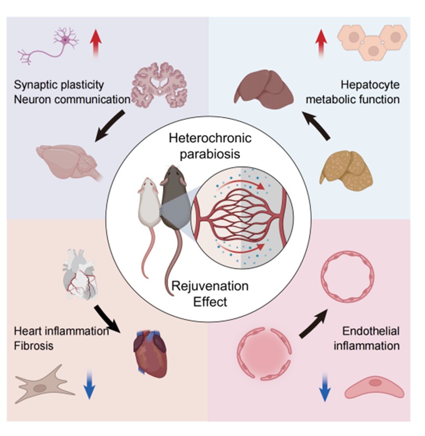 图6 异种共生对衰老相关疾病的改善作用示意图。通过将年轻小鼠与加速衰老小鼠(SAMP8)建立异种共生模型,年轻血液可重塑衰老组织的转录组特征,并对多种衰老相关疾病产生再生和改善作用。该过程通过调控多器官的基因表达网络、降低炎症反应并恢复细胞功能,从而改善衰老小鼠的整体健康状态