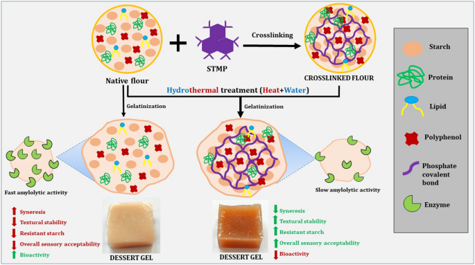 该研究利用三种耐淹紫米品种(Amona、Badal、Kenkowa)开发功能型果冻,通过9% w/w交联剂处理淀粉 flour并替代原米粉0-50%,发现交联显著降低直链淀粉含量(25-30%)、膨胀势(10-15%)和溶解度(20-30%),同时提升冻融稳定性(减少45-55%渗出)。感官评价(模糊逻辑法)显示40%替代的果冻最佳,其硬度、弹性等质地参数和储能模量(G')均显著提高。此外,抗性淀粉增加(改善GI值),微生物指标符合安全标准,并维持高感官评分(>7/9)。Badal紫米经交联后效果最优。