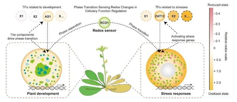 本研究的突破性在于发现RCD1相分离形成的生物分子凝聚体发挥了“空间编码器”的功能,阐明了无序区结构域、细胞氧化还原状态、二硫键动态变化及转录因子选择性招募等多层面协同调控相分离的分子机制,为作物生长-抗逆协同改良的分子设计提供了理论依据和精准靶点。