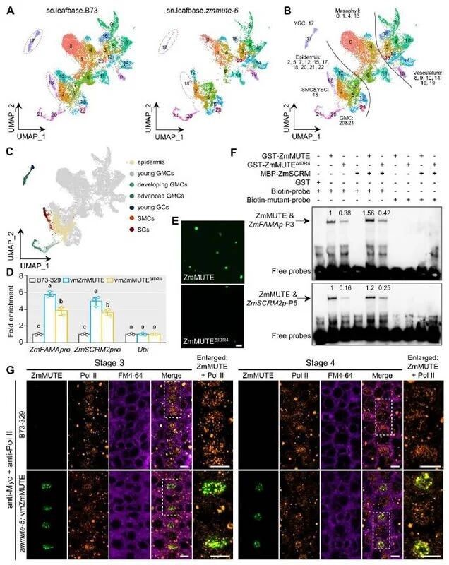 ZmMUTE相分离通过增强DNA结合和靶基因激活调控气孔细胞命运,包含snRNA-seq聚类分析、ChIP-qPCR和EMSA实验结果、凝聚体与Pol II的共定位验证