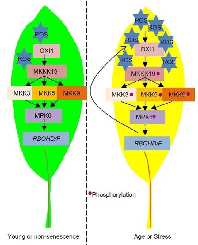 该研究揭示了叶片衰老进程或逆境胁迫诱导叶片ROS积累, 通过激活OXI1-MKKK19-MKK3/5/9-MPK6-RBOHD/F级联途径, 进而调节叶片衰老, 丰富并完善了叶片衰老的信号转导网络,阐释了生长发育、环境胁迫与植物衰老协调调控的重要生物学问题, 为通过遗传调控延缓作物衰老、提升产量提供了重要靶点。