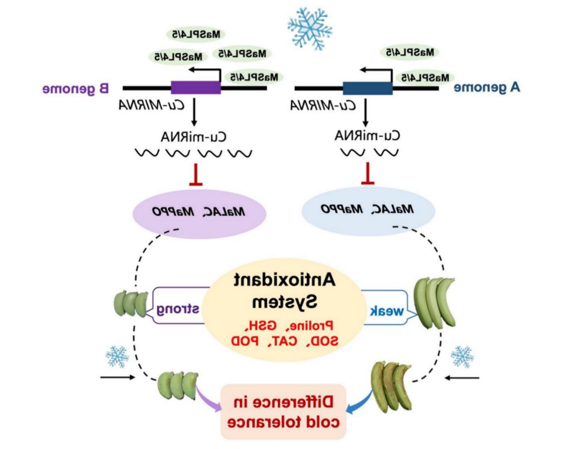 图. Cu-miRNA介导AAA与ABB品种香蕉果实耐冷性差异 相关研究成果以题为“Cu-miRNA-mediated redox homeostasis explains the differences in cold tolerance between AAA and ABB banana varieties”的论文近日在线发表在国际学术期刊Journal of Advanced Research(《前沿研究杂志》) 上