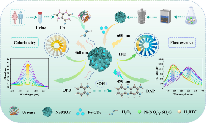 双信号、双功能的Ni-MOF@Fe-CDs探针,用于尿酸的灵敏检测和可视化分析