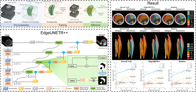 我们开发了EdgeUNETR++,这是一种基于Transformer架构的编码器-解码器模型,其中包含了一个边缘增强模块。我们将该模型应用于包含健康受试者和中风后受试者小腿主要肌肉的MRI数据集,以提取肌肉体积信息。为了进一步评估其在生物力学分析中的潜力,我们评估了分割出的肌肉体积与最佳踝关节扭矩之间的相关性。