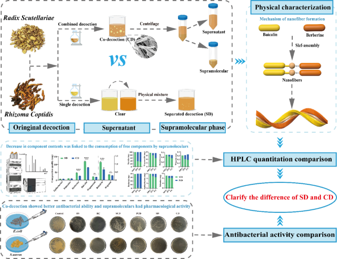 中药配伍提取工艺对超分子形成及抗菌活性影响研究。比较传统合煎与现代分离煎煮方法,发现合煎产生超分子沉淀,显著改变物相及成分分布:分离煎煮中黄芩苷、黄连素等游离成分含量更高,而合煎超分子沉淀中这两类成分富集。经长期储存和低温处理,成分更倾向于进入超分子结构。抗菌实验表明传统合煎制剂抑菌活性最优,超分子沉淀成分同样具有显著抗菌效果。研究揭示了中药配伍通过超分子作用调控成分分布的机制,为传统与现代提取工艺的冲突提供科学解释。