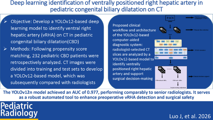 《Pediatric Radiology》:Deep learning model for automated identification of ventrally positioned right hepatic artery in contrast-enhanced computed tomography of pediatric congenital biliary dilatation: development and clinical application
