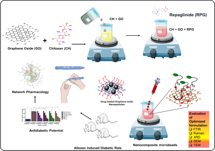 通过网络药理学优化壳聚糖/氧化石墨烯纳米复合水凝胶珠的制备过程,实现瑞格列奈的持续释放,从而改善糖尿病管理