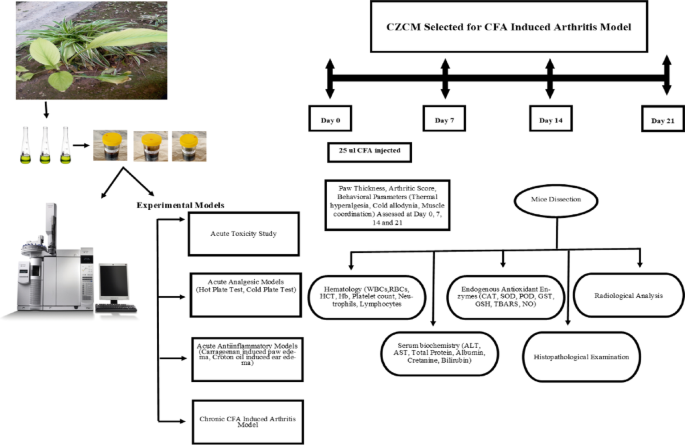 采用气相色谱-质谱(GC–MS)技术分析了其植物化学成分。通过急性镇痛模型和抗炎模型来评估其疗效。根据这些结果,选择了氯仿-甲醇提取物(CZCM),并在CFA诱导的关节炎小鼠中以100、200和400毫克/千克的剂量进行长期评估。在21天的时间内,进行了行为评估、爪部厚度测量、关节炎评分、血液学和生化参数检测、放射学和组织病理学分析以及抗氧化酶(SOD、CAT、GSH、POD、GST、TBARS、NO)测定。