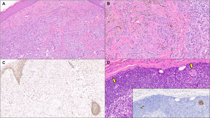 研究发现,MBN好发于中年人的头颈部皮肤。所有肿瘤均位于真皮层,呈膨胀性垂直生长,不累及或仅轻微累及表皮,导致诊断时肿瘤厚度中位数高达8.4 mm,所有皮肤来源的MBN均为Clark V级,初始病理分期高。在诊断时,高达64%的病例已出现微观卫星灶(MS)、前哨淋巴结(SLN)阳性或同步转移,这共同导致了较高的初始分期。免疫表型上,MBNs普遍弥漫性表达HMB45和MART-1,60%的病例存在BAP1核表达缺失。值得注意的是,Ki-67增殖指数在不同病例间差异较大,从1-2%到超过20%不等,提示低增殖指数不能单独用于排除恶性肿瘤。