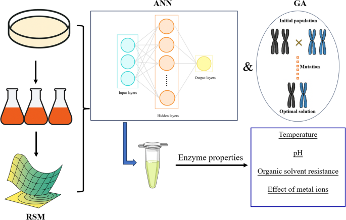 从食品废弃物环境中分离出一种高产脂肪酶的菌株C41802,并通过形态特征、生理生化检测及系统发育分析确定其为Serratia marcescens。为了提高脂肪酶的产量,利用遗传算法-人工神经网络(GA–ANN)模型优化了发酵条件。在优化条件下,对这种粗制胞外脂肪酶的酶学性质进行了研究。结果表明,GA–ANN模型在预测最佳发酵参数和最大酶产量方面优于响应面方法(RSM–CCD),相对误差仅为0.67%,而RSM–CCD的相对误差为2.54%。优化后的发酵条件为:橄榄油10 g/L、葡萄糖8 g/L、牛肉提取物3.1 g/L、K?HPO? 2 g/L、接种量3.5%、培养时间26.2小时、温度30°C以及初始pH值5。在此条件下,脂肪酶的产量达到613.39 U/mL,比未优化前的水平提高了6.45倍。该粗制胞外脂肪酶的最佳温度为70°C,最佳pH值为7,在50°C下孵育12小时后仍能保持52.56%的活性。这些特性凸显了S. marcescens C41802所产生的脂肪酶的工业应用潜力。