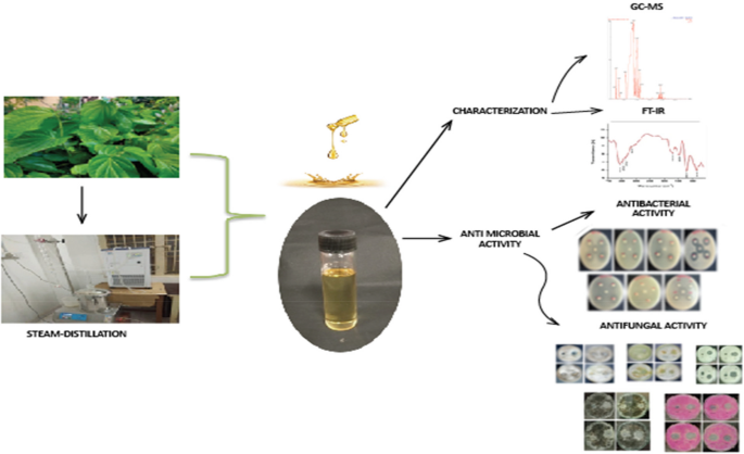 Piper betle叶精油经GC-MS鉴定含10种以上主要成分,FT-IR证实含O-H、C=O等官能团,对7种细菌及5种真菌呈现剂量依赖性抑菌活性,提示其具有治疗应用潜力,需进一步研究机制与扩展应用。