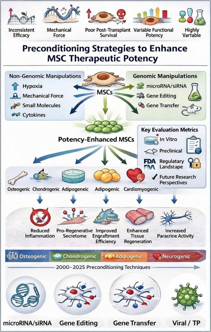 间充质干细胞/基质细胞(MSCs)在再生医学领域具有巨大潜力;然而,其临床应用受到疗效不稳定、移植后存活率低以及功能活性差异较大的限制。预处理技术——即在给药前对MSCs进行体外处理——已成为解决这些问题的关键策略。本文综述了2000年至2025年间开发的主要预处理技术,这些技术旨在提高未分化MSCs的整体适应性或引导其向特定的治疗方向分化,包括成骨、成软骨、成脂、成心肌和成神经方向。我们将这些策略分为两大类:(1)非基因组操作,依赖于短暂暴露于物理、化学或生物信号,如缺氧、机械力、小分子、细胞因子处理和细胞外基质工程;(2)基因组或基因修饰操作,通过microRNA/siRNA调控、CRISPR/Cas基因编辑以及病毒或非病毒基因转移来实现更稳定的改变。对于每种方法,我们总结了相关的分子机制,评估了体外、临床前和临床研究的数据,并分析了关键的转化障碍。我们还考虑了重要的评估指标,包括安全性、植入效率和功能恢复情况(针对不同的疾病模型)。最后,我们结合了临床试验的发展趋势、FDA和EMA的监管动态以及知识产权环境,讨论了可能加速下一代高效MSC疗法开发的未来研究重点。