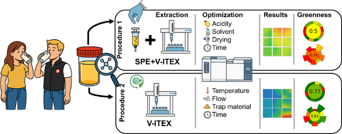 尿液中的挥发性代谢物能够为我们提供关于营养状况和代谢功能的宝贵信息。然而,由于尿液基质的复杂性和变异性,这些代谢物的提取在分析上仍然具有挑战性。本研究比较并优化了两种提取技术:先进行固相萃取再结合真空管内萃取(SPE+V-ITEX)与直接使用V-ITEX的技术,用于尿液挥发性成分的非靶向气相色谱-质谱分析。通过实验设计(DoE)方法,系统地优化了这两种技术的关键参数。对鉴定出的化合物从来源、提取效率及化学类别特异性等方面进行了分析。使用AGREE和AGREEprep工具评估了这两种方法的“绿色性”(即环境友好性和操作效率)。SPE+V-ITEX和直接V-ITEX均实现了广泛的代谢物覆盖,共检测到1198个特征,且重复性良好,其中76%的检测结果的标准偏差(RSD)低于20%。SPE+V-ITEX在某些化合物和化合物组(如醇类、己内酰胺、杂芳香族化合物)中获得了更高的总信号强度,两种方法都表现出足够的重复性。对混合实际样本的时间趋势分析证实,这两种方法均适用于代谢物分析。根据AGREE和AGREEprep的评估结果,V-ITEX被认为是一种更可持续且操作效率更高的工作流程,与绿色分析化学的原则高度契合。脱附流速、捕集材料、提取温度和时间显著影响了直接V-ITEX的性能。虽然观察到化合物特定的差异,但没有一种方法对所有代谢物类别都是最优的。这些发现表明,直接V-ITEX是一种稳健、环保且高效的替代方案,适用于尿液挥发性组学研究,尤其适合于需要最少人工操作的高通量分析流程。